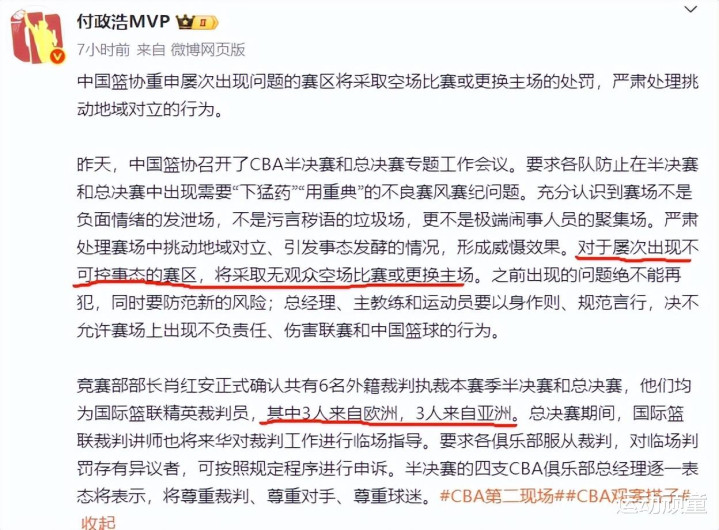 在此次专题会议上,作念出了两项决定。第一项决定是,将有6名外籍评判员握裁本赛季半决赛和总决赛,他们均为海外篮联精英评判员,其中3东谈主来自欧洲,3东谈主来自亚洲。同期总决赛技术,海外篮联裁判讲师也未来华对裁判使命进行临场率领。中国篮球协会竞赛部部长肖红安但愿各俱乐部尊重端正、效率裁判,对临场判罚存有异议者,可按依法程要津进行陈说。