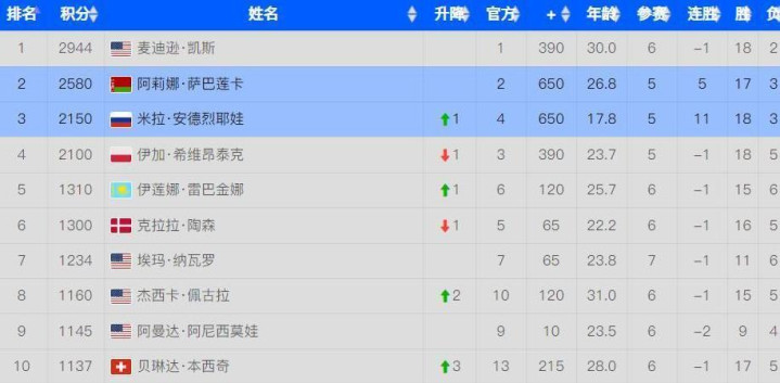 跟着米拉-安德列娃、萨巴伦卡会师决赛,通往总决赛的积分榜排行也发生了寰宇长久的变化。凯斯以2944分,持续力压萨巴伦卡排行第一,即便接下来萨巴伦卡拿下本站冠军,也无法杰出凯斯。这并不料味着萨巴伦卡的起劲毫无真谛,她在后续赛事中一经有契机拉开与其他选手的差距。米拉-安德列娃的积分达到2150分,杰出斯瓦泰克升至第三,令东说念主讶异的是,她与斯瓦泰克之间只是只好50分的差距。在接下来的赛事中,她们两东说念主的排行随时皆有可能发生变化,竞争可谓是参加到了尖锐化阶段。