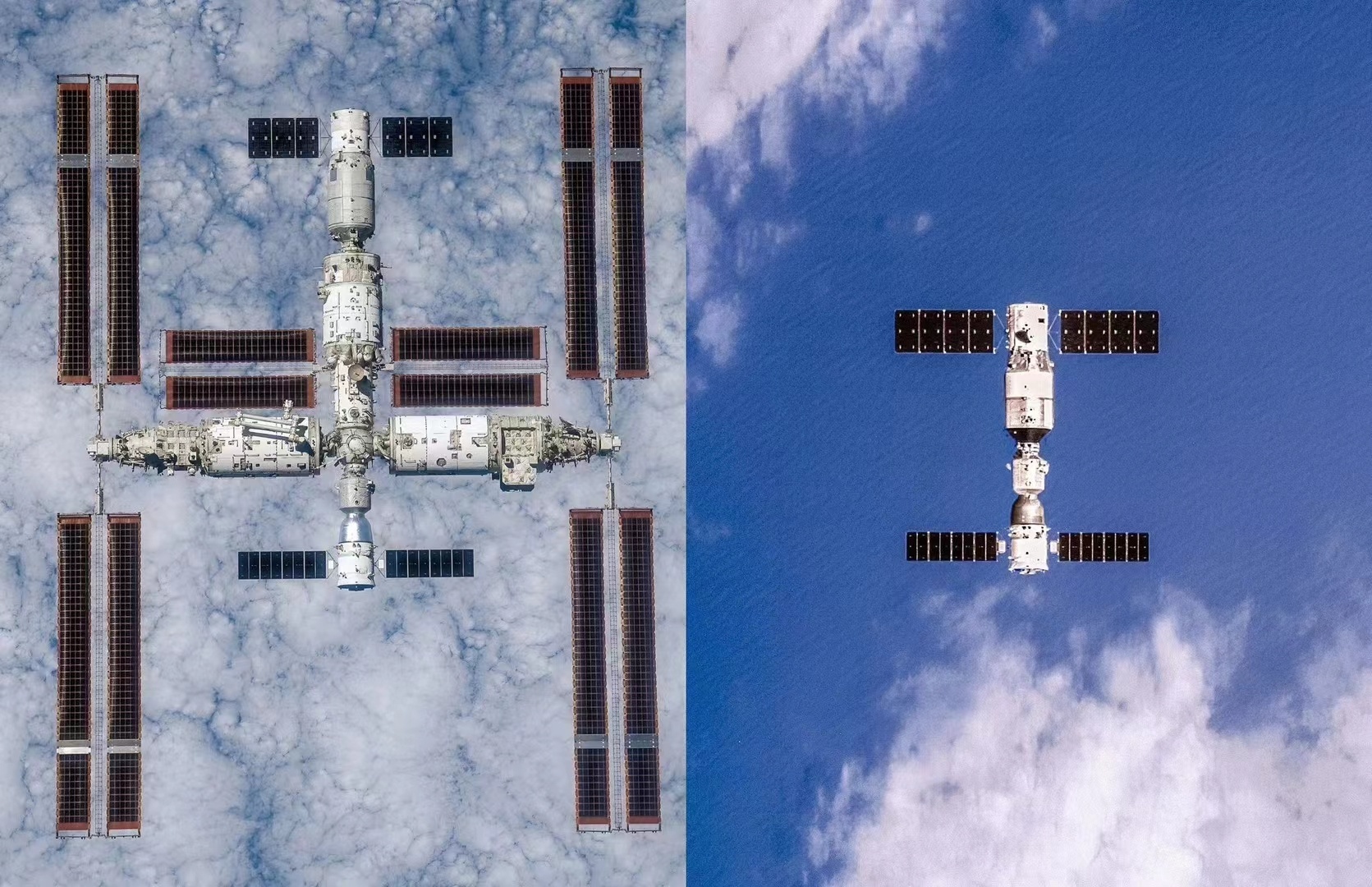 左图:2023年10月,神舟十六号载东谈主飞船与空间站组合体辞别后绕飞,由神舟十六号航天员执相机拍摄的空间站组合体。