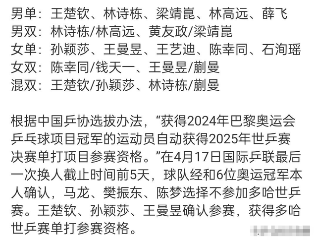 多哈世乒赛的参赛东谈主员,早在4月21日就还是公布出来。